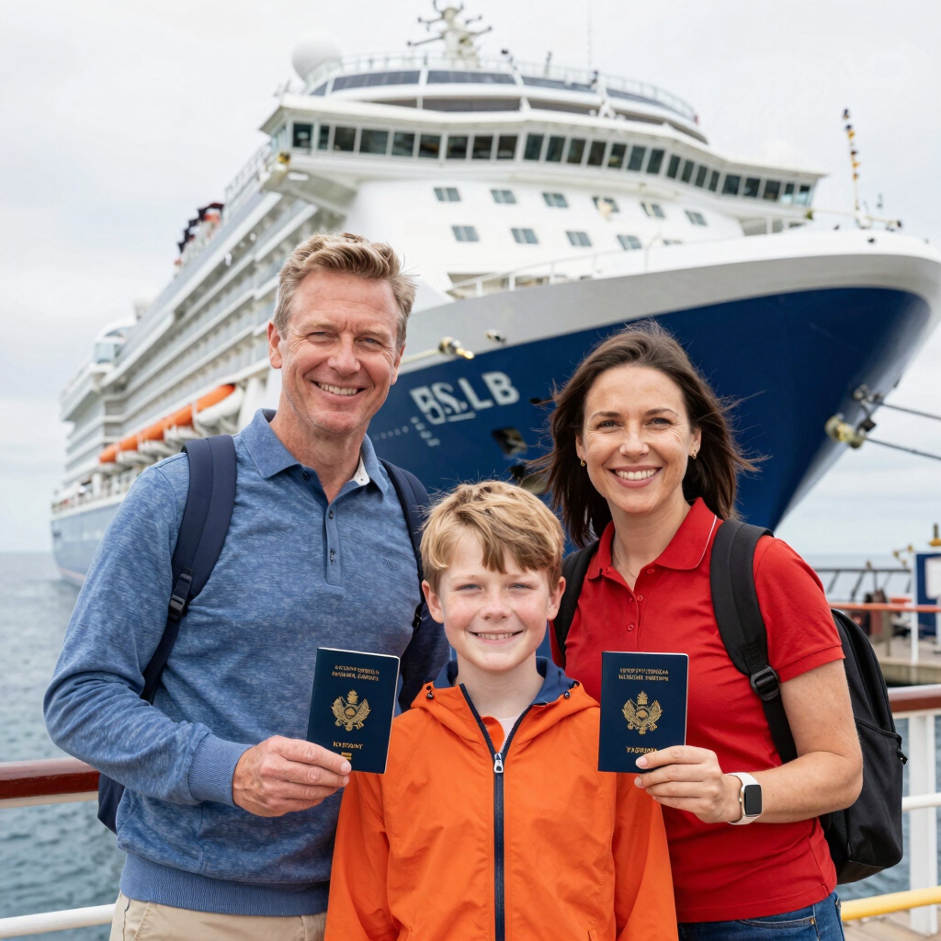 A family happily holding their passports about to depart on a cruise
